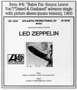 Item #4: Advance 7-inch single with picture sleeve."Babe I'm Gonna Leave You" backed with "Dazed & Confused." (Atlantic EP.1019). Sent to radio in advance of Led Zeppelin's release; mono and stereo versions exist.