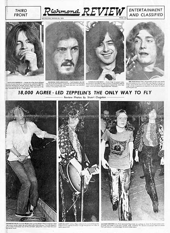 It never dawned on me that anybody else in the world would have any interest in these mementos and so I was somewhat surprised to get a call on a Sunday night a while ago from Eric Von Schlippen. Eric was holding in his hand a yellowing copy of the March 23, 1970 edition of the Richmond Review, a community paper I had worked at in that time, featuring a full-page spread of Led Zeppelin photos that I taken in and around their concert appearance in Vancouver.